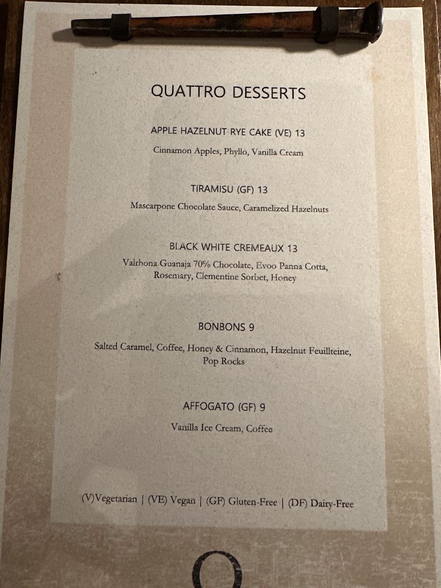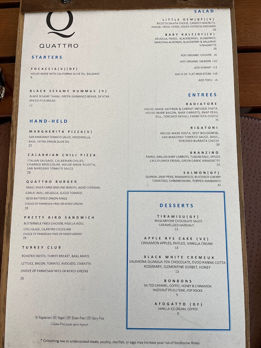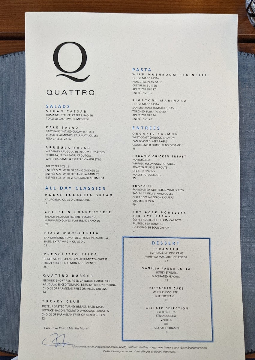 With a rotating daily soup, such as the highly praised tomato basil, and a diverse cocktail menu, Quattro offers something for everyone. Whether you’re sipping on a uniquely crafted drink or indulging in one of the delectable desserts adorned with artistic flair, every moment at Quattro is designed to impress.